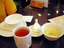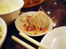 | 小龍包。48HK$やっぱウマイ | 針生姜入りのタレでさっぱりと 頂きます。 |