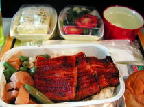機内食のサービスが始まったが、空港でお粥を食べたばかりだったし、またトイレに行きたくな