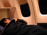 食べるものや飲物はまああるんだけど、椅子の数に比べてテーブルがすごく少ない上に小さい ので、持ってきてゆっくり味わうという雰囲気ではない。 ANAもケチだけどTGもそれに輪をかけてケチだなあ・・・ ここに居てもあんまり居心地良くないし、早く機内に入りたい!!! 時間になったらさっさとゲート前に移動して、早めに機内に入る。 ここでラッキーなハプニング!旧型のシートだとばっかリ思っていたら、なんと最新のフルフ ラットシートだった!やったー これは少々傾斜はつくものの、シートが前にせり出して180度になるシートなので仰向けは もちろん、横になっても寝られる。 真夜中のフライトで早朝に到着なのでこれは嬉しい! 疲れていたのでドリンクも貰わずすぐに就寝。zzzz |