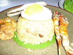「お昼も出歩きたくないので、ルームサービスにしよう」と、夫が言う。 私も出歩きたくないのは一緒だが、ルームサービスと言っても、ランチは、サンドイッチやハンバーガーなど 朝食の延長みたいなものしかない。 昨日の「リビングルーム」のハズレも大きかったし・・と思い、インドネシアンのテイクアウトでリベンジすべく 近所のレストランをブラブラ探してみる。 ヴィラから少し奥へ歩いたところに、「トーフカフェ」という、文字通りお豆腐メインのレストラン (でもどう見ても地元のワルン)があった。 中を覗くと、近所のヴィラに仕事に来ている、大工さんや、家族連れなどで結構賑わっている。 これは当たりかも!?と、入ってみて持ち帰り出来るか聞いたら、モチロンOKという事で イカンバカール、ナシプティ、ミーバクソを箱に入れてもらい、テイクアウェイ。 値段も日本円で300円程度(昨日のリビングルームの10分の1以下)と、申し訳ないような値段 だったのに、かなり美味かった。 お店の人も親切で、当たり〜!\(o・ ▽ ・o)/ \(o・ ▽ ・o)/ のんびりとプールサイドのテーブルで、昼食。