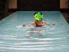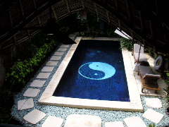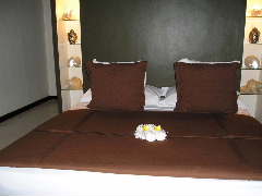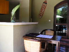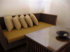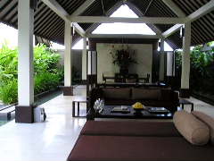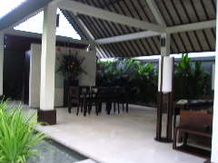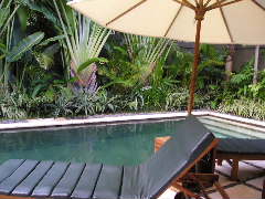 昼食後は、昼寝をしたり本を読んだり、ビールを飲んだりと、のんびりと過ごし、暑くなったらプールで クールダウン。 なんだか脳味噌も、トロトロと、とろけていくんじゃないかというよな体たらくである。 「こんなんでいいの〜??」と夫に聞いたら、「いいんじゃない」と、これまた自堕落な返事。 こんなじゃいけない!!と、夫を近所のお散歩に誘うが、DVDに夢中になっていて「勝手に行ってくれば?」 と、けんもほろろに断られる。 じゃあいいわよ!と、ナマケモノは部屋に残して、デジカメをもってブラブラと近所を歩く事に・・ 昨日自転車で出たときは気付かなかったが、すぐ隣りに「プリ・ラティ・バリ・ホテル」と 「アルバリ(ヴィラ)」があった。 アイランドヴィラもそうだが、道路に直接面していないので、よく見ないと気付かない。 フラフラと歩いて行って、『アルバリ』のフロントオフィスへ行き、また昨日のように見せてもらえな いかと交渉してみたら、ここもスンナリオーケー。 今空いているという2ベッドルームヴィラを見せてもらう。